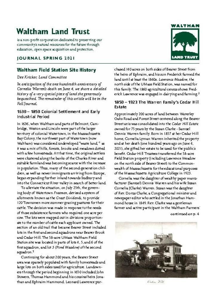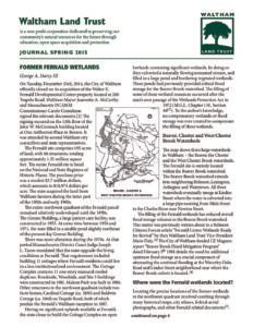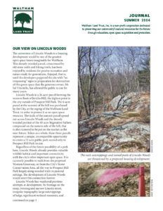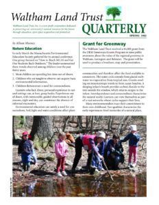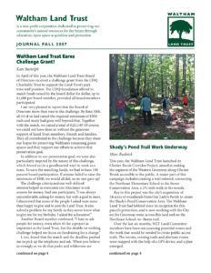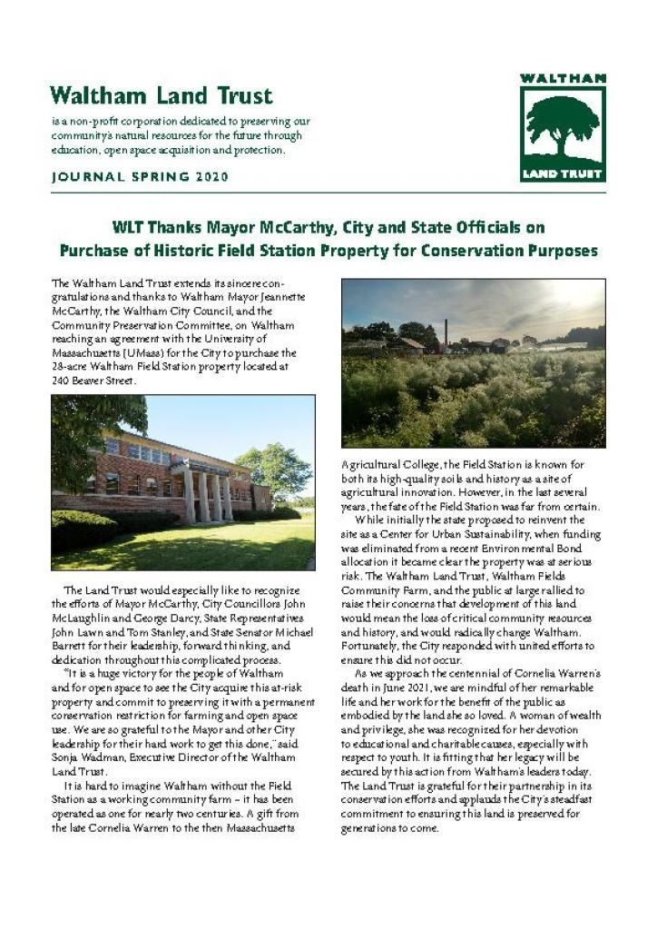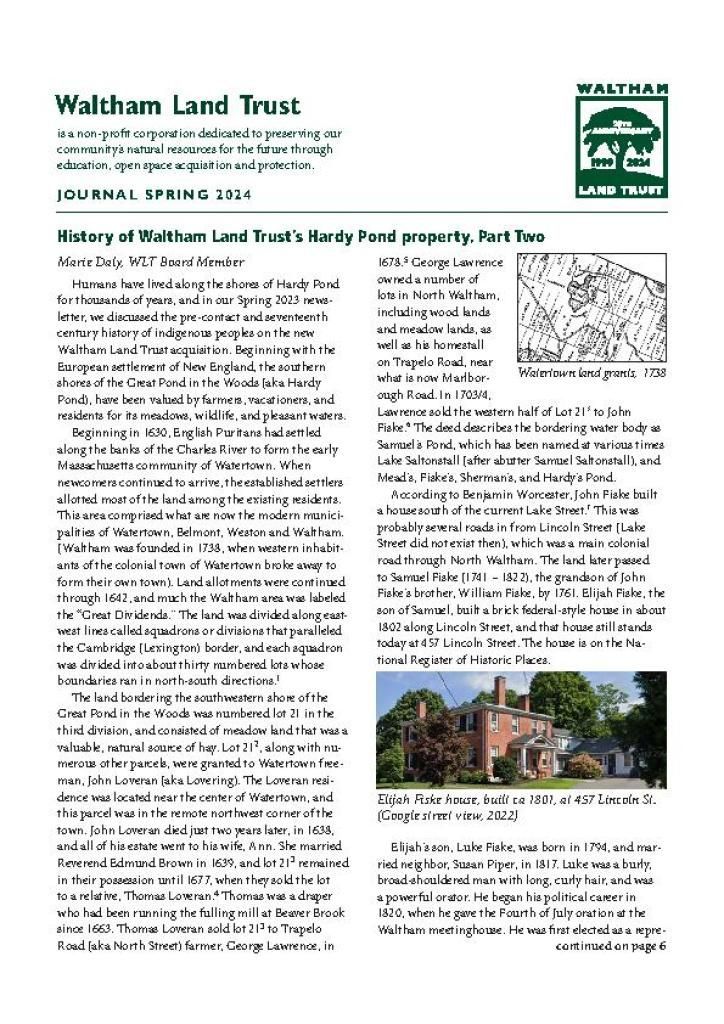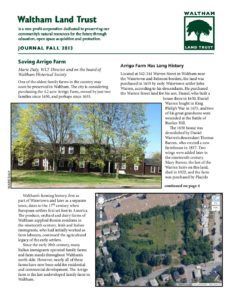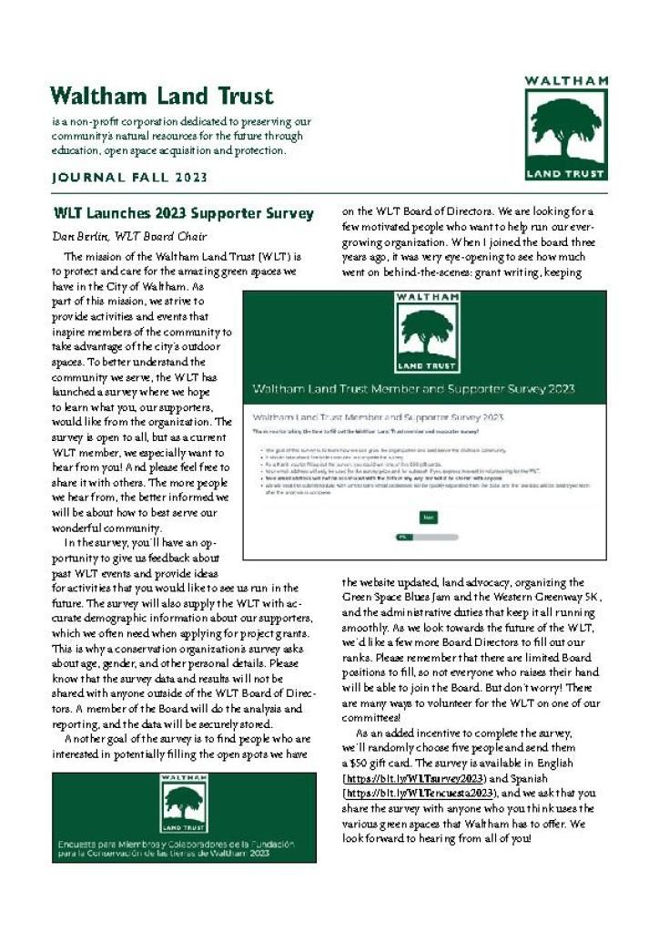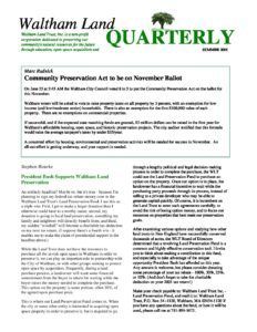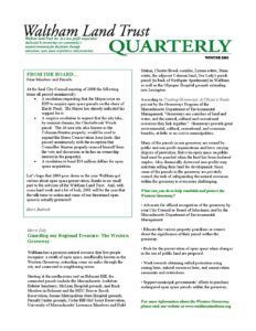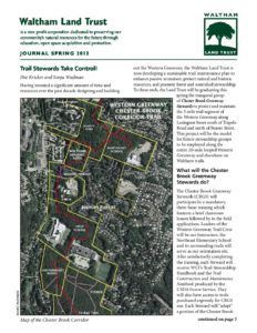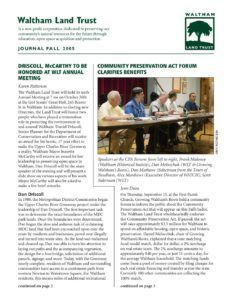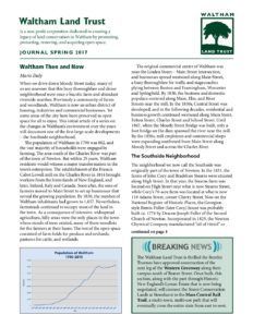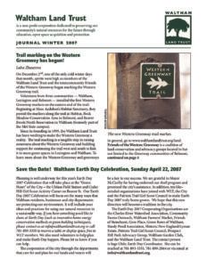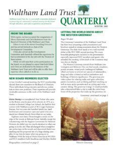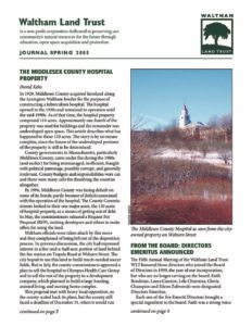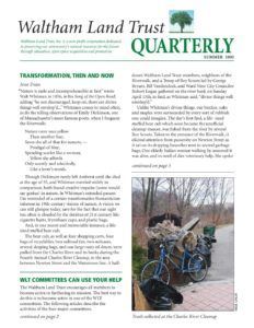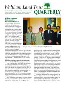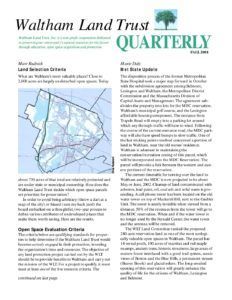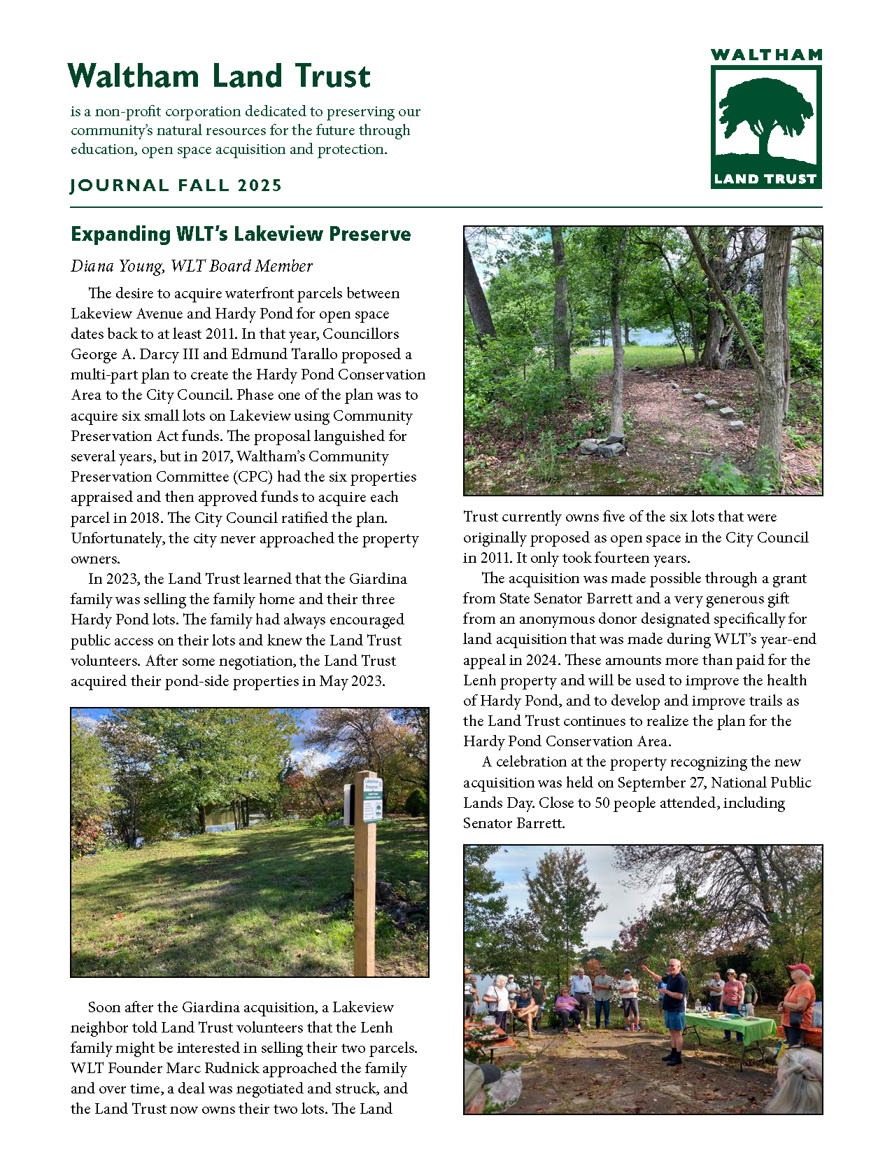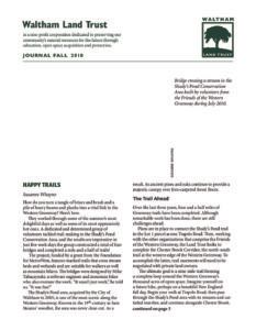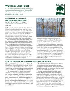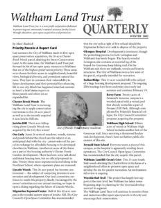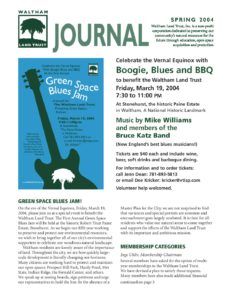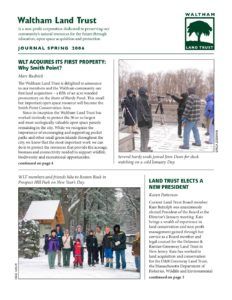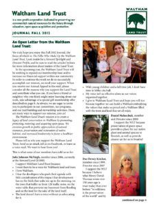 The Waltham Land Trust has been producing newsletters since the spring of 2001. New issues of our newsletter, now called The Journal, are mailed or emailed to members. After a new newsletter is released the previous newsletter is made available here.