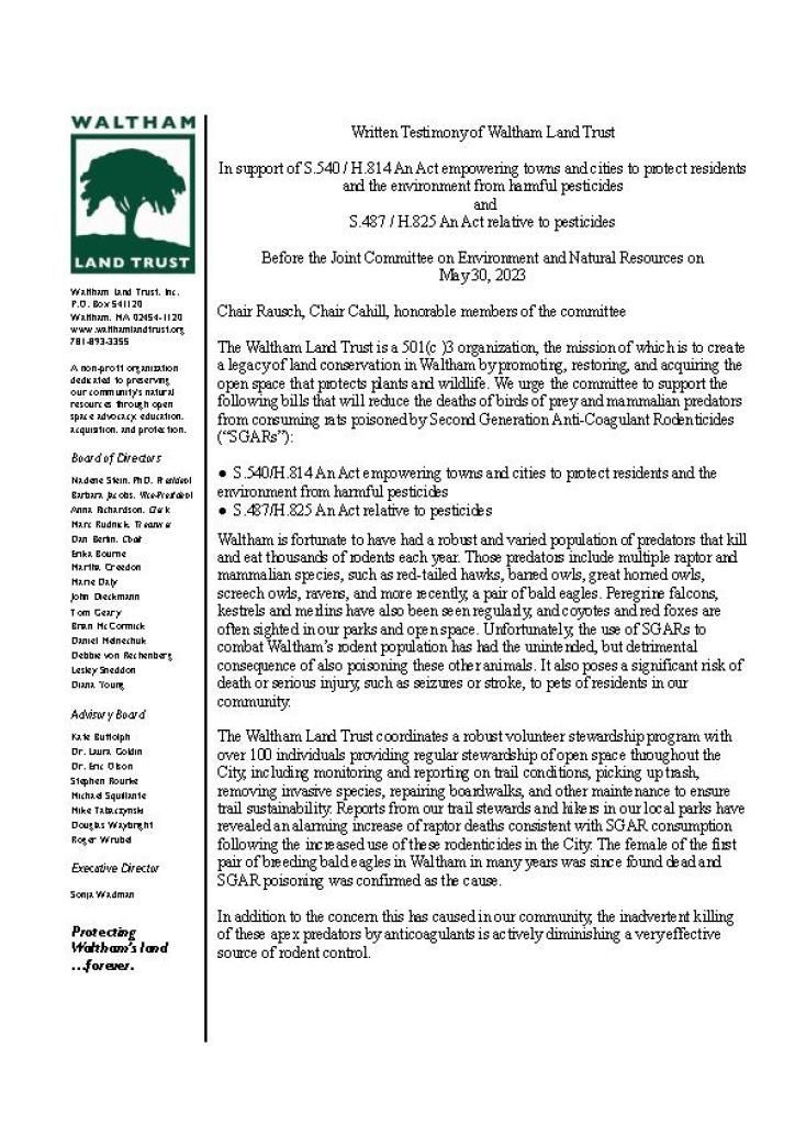 Later in May 2023, the Waltham Land Trust submitted a letter of support for two bills at the statehouse, one of which gives control to local communities regarding use of pesticides. You can read it below.